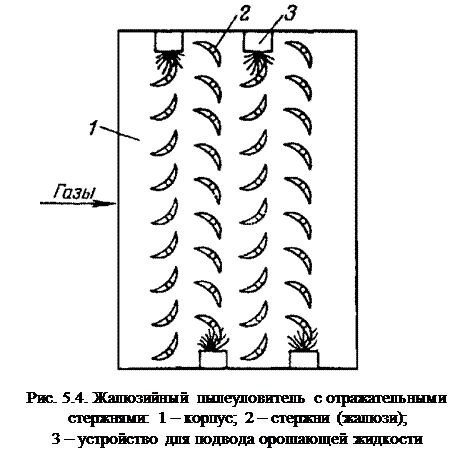 В жалюзийном пылеуловителе струи газа, огибая пластины, резко изменяют направление движения, проходят на другую сторону решетки и движутся в прежнем направлении. Частицы пыли, встречаясь с пластинами решетки, стремятся по инерции сохранить первоначальное направление движения, не огибают пластину, а ударяются о ее поверхность, отражаются в сторону, противоположную движению газов, опять поворачивают по направлению газового потока, ударяются о следующую по ходу газа пластину и т. д. В результате газы, прошедшие через решетку, очищаются, а газы, оставшиеся по другую сторону решетки, обогащаются пылью. Эта часть газового потока (около 10 % от общего объема газов) направляется для окончательной очистки в другой пылеуловитель (чаще всего центробежный циклон). При повышении скорости подхода газов к пластинам решетки степень улавливания пыли в жалюзийном пылеуловителе вначале быстро растет – начиная со скорости около 10 м/с этот рост замедляется. Обычно жалюзийные пылеуловители работают со скоростью газов 12…15 м/с. На степень улавливания пыли существенное влияние оказывает скорость движения газов, отсасываемых в центробежный циклон. Для того чтобы в циклон было отведено больше пыли, эта скорость должна быть не меньше скорости газов при подходе к жалюзийной решетке. Рекомендуемое гидравлическое сопротивление решетки жалюзийного пылеуловителя составляет 98…490 н/м2 (10…50 мм вод. ст.), а циклонов 98…245 н/м2 (10…25 мм вод. ст.). Кроме того, по мере износа жалюзийной решетки степень улавливания пыли жалюзийным пылеуловителем снижается. Поэтому область применения жалюзийных пылеуловителей ограничена. Их используют для улавливания относительно крупной пыли с частицами размером больше 20 мкм. Если запыленный поток сталкивается с каким-либо телом, поток обтекает его, а частицы пыли, обладающие большей инерцией, ударяются о поверхность этого препятствия и могут осесть на ней. Этот принцип использован в аппарате, показанном на рисунке 5.4. В нем установлено несколько рядов стержней, имеющих форму полумесяца. Осевшая на стержнях пыль смывается водой.