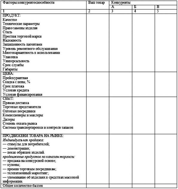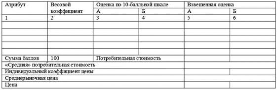 АНАЛИЗ КОНКУРЕНТОСПОСОБНОСТИ ТОВАРОВ Для выполнения практикума необходимо наличие двух образцов различных марок однотипного товара, выполняющих одинаковую базовую функцию и предназначенных для одного сегмента покупателей. Присвойте каждому из образцов товаров этикетку «А» и «Б». При выполнении дальнейшей экспертной оценки следует отойти от собственного мнения и попытаться дать обобщенную оценку, которую могли бы дать другие покупатели данного товара. Определите перечень атрибутов (показателей), которые учитываются потребителями при покупке данного вида товара (не рекомендуется в качестве параметра рассматривать цену, поскольку именно она является искомым параметром). Оцените степень важности атрибутов для покупательского выбора, распределив 100 баллов между весовыми коэффициентами атрибутов товара. Для каждого образца определите степень присутствия (реализованности) атрибутов по десятибалльной шкале. В качестве эталона для сравнения используйте ваше представление об идеальном товаре такого рода. Рассчитайте взвешенную оценку каждого показателя как произведение весового коэффициента на оценку параметра. Рассчитайте оценку потребительной стоимости каждого варианта как сумму взвешенных оценок. Рассчитайте среднее значение потребительной стоимости для двух товаров. Определите коэффициент изменения цены каждого товара как отношение индивидуальной оценки потребительной стоимости к средней. Определите рекомендуемую цену каждого образца товара. Для этого сначала дайте экспертную оценку средней рыночной цене, сложившейся на рынке для товаров определенного типа. Рекомендуемую цену определите как произведение индивидуального коэффициента на среднюю цену. Таблица 18.