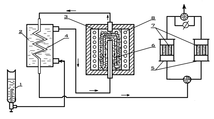 Схема одержання дисоційованого аміаку приведена на рис.4. 1 - Балон з аміаком; 2 - Випарник високого тиску. 3 - Дисоціатор (700 - 950°С). 4 - Трубопровід з гарячим дисоційованим аміаком. 5 - Колонки адсорбера. 6 - Реторта з каталізатором (залізна стружка, окисли заліза). 7 - Силікагель. 8 - Нагрівач.
