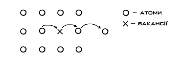 1. Атом переходить на більш високий шар (внаслідок теплових коливань при нагріванні) і на його місці утворюється вакансія, що заповнюється наступним атомом з більш глибокого шару, а на його місці утворюється нова вакансія. Відбувається ніби міграція вакансій. Такий спосіб - дефекти по Шотке (рис. 7). Рисунок 7 – Схема утворення дефектів по Шотке