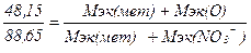 Мэк (оксида) = Молярная масса эквивалентов химического соединения равна сумме молярных масс эквивалентов составляющих его частей. Оксид – это соединение металла с кислородом, поэтому молярная масса эквивалентов оксида представляет собой сумму Мэк (оксида) = Мэк (металла) + Мэк (кислорода). Отсюда Мэк.(металла) = Мэк.(оксида) − Мэк.(кислорода) = 35,45 – 8 = 27,45 г/моль. Молярная масса эквивалентов элемента (Мэк.) связана с атомной массой элемента (МА) соотношением: Мэк (элемента) = Таким образом, Мэк. (оксида) = 35,45 г/моль; Мэк. (металла) = 27,45 г/моль; МА (металла) = 54,9 г/моль. Пример 2.6. При взаимодействии кислорода с азотом получено 4 моль эквивалентов оксида азота (IV). Рассчитать объемы газов, вступивших в реакцию при нормальных условиях. Решение. По закону эквивалентов число молей эквивалентов веществ, вступающих в реакцию и образующихся в результате реакции, равны между собой, т.е. υ (О2) = υ (N2) = υ (NO2). Так как получено 4 моль эквивалентов оксида азота (IV), то, следовательно, в реакцию вступило 4 моль эквивалентов О2 и 4 моль эквивалентов N2. Азот изменяет степень окисления от 0 (в N2) до +4 (в NО2), и так как в его молекуле 2 атома, то вместе они отдают 8 электронов, поэтому Мэк (N2) = 28 г/моль N2 – 22,4 л 3,5 г/моль N2 – х х = Так как в реакцию вступило 4 моль эквивалентов N2, то их объем составляет V (N2) = 2,8·4 = 11,2 л. Зная, что моль эквивалентов кислорода при н.у. занимает объем 5,6 л, рассчитываем объем 4 моль эквивалентов О2, вступивших в реакцию: V (O2) = 5,6·4 = 22,4 л. Итак, в реакцию вступило 11,2 л азота и 22,4 л кислорода. Пример 2.7. Определить молярную массу эквивалентов металла, если из 48,15 г его оксида получено 88,65 г его нитрата. Решение. Учитывая, что Мэк (оксида) = Мэк (металла) + Мэк (кислорода), а Мэк (соли) = Мэк (металла) + Мэк (кислотного остатка), подставляем соответствующие данные в закон эквивалентов: