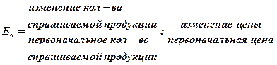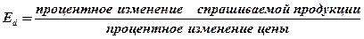 Процентное изменение вычисляется путем деления величины изменения в цене на первоначальную цену и следующего за этим изменения в количестве спрашиваемой продукции на то количество продукции, на которое спрос предъявляется первоначально. Поэтому формулу можно представить в виде: