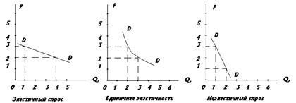 Спрос является эластичным, если данное процентное изменение цены ведет к большему процентному изменению количества спрашиваемой продукции. Например, если снижение цены на 2% вызывает рост спроса на 4%, спрос является эластичным. Очевидно, что во всех подобных ситуациях, когда спрос эластичен, коэффициент эластичности будет больше единицы; в данном случае он равен 2. Спрос имеет единичную эластичность, когда изменение цены и продаж оказались равновеликими. Спрос неэластичен, если даже при весьма существенных снижениях цены объем продаж возрастает незначительно. Для наглядности ценовую эластичность спроса можно продемонстрировать с помощью графиков, где наклон кривой спроса соответствует этому состоянию эластичности.