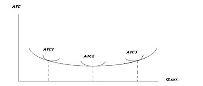 Издержки производства в долгосрочном периоде В долгосрочном периоде фирма может изменять все используемые факторы производства. Значит, все издержки выступают в качестве переменных. Дуга AC описывает кривые средних издержек ATC1, ATC2, ATC3, при объемах производства в 2000 ед., 4000 ед., 6000 ед., и представляет собой кривую долгосрочных