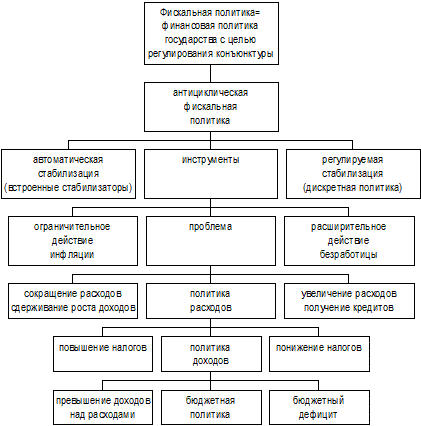 Важнейшим инструментом государственного регулирования экономики, направленным на стабилизацию экономического развития, является фискальная политика. Мы можем определить ее как политику, направленную на регулирование и предотвращение нежелательных изменений совокупного спроса, посредством планируемых изменений государственных расходов и налогов. Концепция фискальной политики как созидательного инструмента обеспечения полной занятости, ценовой стабильности и экономического роста была выдвинута и обоснована Дж. М. Кейнсом и представителями так называемой Стокгольмской школы. Суть кейнсианского анализа состоит в том, что общее равновесие макроэкономики вовсе не должно соответствовать такому уровню национального дохода, который позволяет обеспечить полную занятость и экономика, весьма вероятно, может попасть либо в ситуацию безработицы, либо инфляции. Однако, по мнению Кейнса и его последователей, существует рецепт решения этих проблем, а именно, государственное воздействие на величину совокупного спроса.