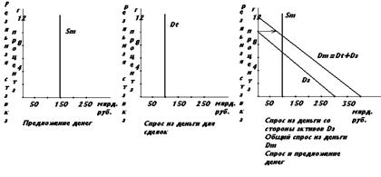 а б в Рис. 14.1. Предложение денег (а), спрос на деньги (б), спрос и предложение денег, равновесие на денежном рынке (в)