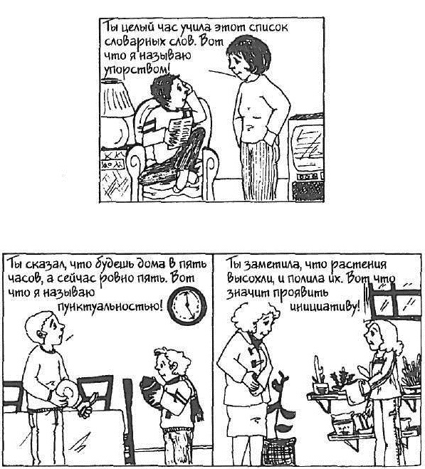 В этом списке слов нет ничего строго предназначенного для конкретных целей. Нет правильных или ошибочных ответов. Суть в том, чтобы найти такое слово, которое скажет вашему ребенку что‑то такое, чего он не знал о себе раньше, даст ему новую словесную характеристику. Что лично мне нравится в таком типе похвалы, так это логика «делаешь, значит, способен». Нужно действительно смотреть, слушать, замечать и затем вслух говорить, что вы видите и что вы ощущаете. Один человек однажды поинтересовался, как такой простой процесс может так глубоко воздействовать на ребенка. И тем не менее день за днем из наших описаний дети узнают о своих сильных сторонах. Ребенок открывает для себя, что он может дикий беспорядок превратить в чистую и убранную комнату; что он может подарить что‑то полезное и приятное; что он может держать внимание зрительного зала; что он может написать трогательное стихотворение; что он способен быть пунктуальным, продемонстрировать силу воли, инициативность или находчивость. Все это попадает в его эмоциональное хранилище и не может быть отнято у него. Вы можете отобрать у него «хорошего мальчика», назвав «плохим мальчиком» на следующий день. Но вы никогда не сможете отнять у него тот момент, когда он порадовал свою маму открыткой с пожеланием выздоровления, или момент, когда он уделил занятиям много времени и добился результата, даже несмотря на то, что очень устал. Такие моменты, когда родители одобряют все самое лучшее в детях, становятся критериями жизни, к которым дети могут вернуться в периоды сомнений или упадка духа. В прошлом ребенок сделал что‑то, чем он может гордиться. Это внутри его, и он может снова это совершить.