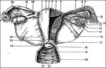 1 – тело матки; 2 – серозная оболочка (периметрии); 3 – дно матки; 4 полость матки; 5 – слизистая оболочка матки (эндометрий); 6 – маточное отверстие трубы; 7 – брыжейка маточной трубы; 8 – трубные складки; 9 – придаток яичника; 10- воронка маточной трубы; 11 – бахромки трубы; 12 – правый яичник; 13- растущие фолликулы; 14- желтое тело; 15- круглая связка матки; 16 – мышечная оболочка матки; 17, 25 – надвлагалищная часть шейки матки; 18 – отверстие матки; 19 – мышечная оболочка влагалища; 20 – слизистая оболочка влагалища; 21 – столбы складок; 22 влагалищные складки; 23 – шейка матки (влагалищная часть); 24 – канал шейки матки; 26 – ампула маточной трубы; 27 – перешеек маточной трубы; 28 – собственная связка яичника. Яичник – парная половая железа, ее вес – 5-8 г. В ней происходит развитие и созревание женских половых клеток (яйцеклеток), а также образование женских половых гормонов. В яичник входят сосуды и отростки нервных клеток. Он состоит из наружного коркового и внутреннего мозгового слоев и заключен в соединительнотканную оболочку. Наружный корковый слой содержит развивающиеся фолликулы, в которых образуются яйцеклетки. Зрелый яичниковый фолликул достигает в разрезе 0,5-1 см. По мере созревания фолликул постепенно достигает поверхностного слоя яичника. В течение 28-30 дней развивается обычно 1 фолликул. Зрелый фолликул называется граафовым пузырьком. Своими протеолитическими ферментами он растворяет белковую оболочку и, лопаясь, освобождает овоцит второго порядка – яйцеклетку. Этот процесс называется овуляцией. Овоцит второго порядка попадает сначала в брюшную полость, а затем на бахромки маточной трубы и далее в маточные трубы. В отличие от образования спермиев, которое начинается у мужчин только при половом созревании, образование яйцеклеток у женщин начинается еще до их рождения и завершается для каждой данной яйцеклетки только после ее оплодотворения. В ходе оогенеза (овогенеза), т.е. развития яйцеклеток, различают этапы деления, роста и созревания (мейоз). На этапе митотического деления увеличивается число оогониев (овогониев). Затем начинается период роста клеток, в это время клетки называются овоцитами первого порядка. Они увеличиваются в размере. Этап роста у ряда животных и человека может длиться годами. Овоцит окружен одним слоем клеток и образует примордиалъный фолликул. Женский эмбрион непосредственно перед рождением содержит 2x106 этих фолликулов. Лишь примерно 450 из них достигают стадии овоцитов второго порядка и выходят из яичников (овуляция). Следует отметить, что овогенез продолжается до образования овоцитов второго порядка в стадии метафазы мейоза II. Лишь после оплодотворения второе мейотическое деление доходит до конца, и образуется яйцо. Date: 2015-09-25; view: 702; Нарушение авторских прав |
