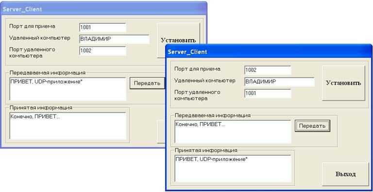 Листинг 13.3 Код модуля формы приложения-клиента 1: Option Explicit 2: 3: Dim SetupEnabled As Integer 'переменная для управления CmdSetup 4: 5: Private Sub Form_Load() 6: 7: SetupEnabled = 0 8: udpPeer.Protocol = sckUDPProtocol 9: 10: End Sub 11: 12: Private Sub CmdSetup_Click() 13: ' установка параметров соединения 14: 15: 'порт для приема данных: 16: If Len(Trim(Text1.Text)) > 0 Then _ 17: udpPeer.Bind Text1.Text 18: 'имя (IP-адрес) удаленного компьютера: 19: If Len(Trim(Text2.Text)) > 0 Then _ 20: udpPeer.RemoteHost = Text2.Text 21: 22: 'удаленный порт: 23: If Len(Trim(Text3.Text)) > 0 Then _ 24: udpPeer.RemotePort = Text3.Text 25: 26: End Sub 27: 28: Private Sub CmdSend_Click() 29: ' отправить данные клиенту: 30: 31: udpPeer.SendData txtOutPut.Text 32: 33: End Sub 34: 35: 36: Private Sub udpPeer_DataArrival(ByVal bytesTotal As Long) 37: 38: Dim strData As String 39: 40: ' принять данные от клиента: 41: udpPeer.GetData strData 42: 43: ' отобразить принятые данные в текстовом окне: 44: txtInPut.Text = strData 45: 46: End Sub 47: 48: 49: Private Sub CmdExit_Click() 50: ' закрыть приложение: 51: 52: Unload Me 53: 54: End Sub 55: 56: ' процедуры для активизации кнопки передачи данных 57: Private Sub Text1_Change() 58: 59: SetupEnabled = SetupEnabled + 1 60: If SetupEnabled = 3 Then CmdSetup.Enabled = True 61: 62: End Sub 63: 64: 65: Private Sub Text2_Change() 66: 67: SetupEnabled = SetupEnabled + 1 68: If SetupEnabled = 3 Then CmdSetup.Enabled = True 69: 70: End Sub 71: 72: 73: Private Sub Text3_Change() 74: 75: SetupEnabled = SetupEnabled + 1 76: If SetupEnabled = 3 Then CmdSetup.Enabled = True 77: 78: End Sub В строке 8 задается протокол обмена — UDP, поскольку по умолчанию используется TCP. Процедура CmdSetup_Click (строки 12–26), используя, быть может, заполненные окна, определяет основные свойства элемента Winsock. Остальные элементы кода листинга, практически, не отличаются от тех, что представлены в листингах 13.1 и 13.2. После установления параметров соединения приложение готово передавать и принимать данные. На рис. 13.5 представлены диалоговые окна приложений, имеющих один и тот же исходный код и выполняющихся на одном компьютере (в случае обмена между двумя компьютерами в окнах Удаленный компьютер необходимо было бы ввести различные имена компьютеров).
