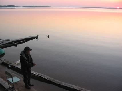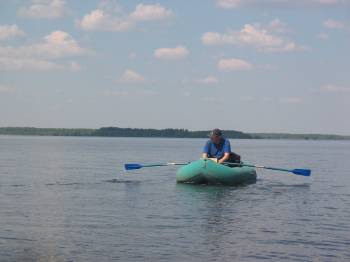 Занимался солнечный день, и завершалась наша безветренная идиллия. С запада начало задувать. Скоро мы обогнем восточный мыс с «домом рыбака» и окажемся во власти встречного ветра. А там довольно долго плыть по Федоровскому заливу в сторону «Большой Земли». У села Федоровское будет крутой поворот и далее путь по проливу - протоке в сторону нашего авто.