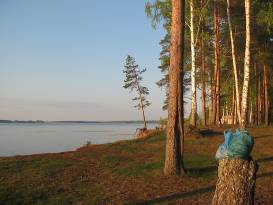 Вот и красивое побережье с видом на Уходово. Здесь кучкуется пара машин, привычный мусор. Место вполне не захвачено еще жадным частником, хотя столбики поперек дороги говорят о таковых намерениях богатой части населения. Но, как сказал один местный рыбак: с какой настойчивостью зарывают столбик, - с еще большей ненавистью народ выдирает. Для нас главное, чтобы обратный путь не был заблокированным. Мы собирались провести на острове два выходных дня.