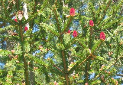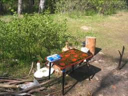 И вот такое место. Большой пляж с невысоким, но крутым бережком. На нем несколько сосен и елей, на одной из них совершенно красные шишки. Рядом с пляжем уютный уголок с живописным столиком «под Хохлому».