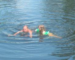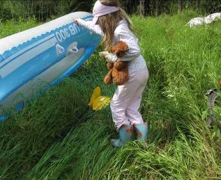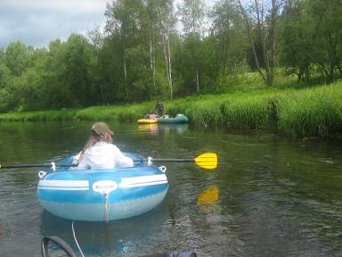 Полинка самостоятельно купалась на пляжике с «лягушками» на плечах, затем так же самостоятельно вернулась к месту погрузки. И пообедав, чем Бог послал, в довольно жаркую погоду отправились в наш поход по таинственной Березайке, которая «окунулась» в леса.