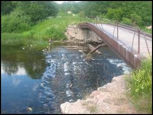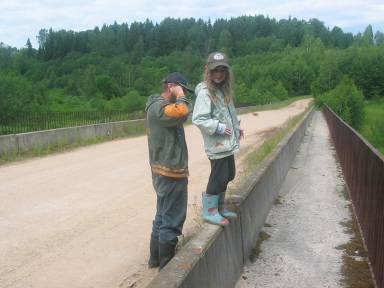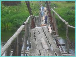 Кривой висячий мостик у деревни Шляхово. На нем рыбак городского дачного вида, а вскоре и наша команда во главе с Джулей шествует по мостику.