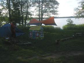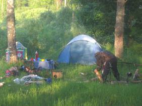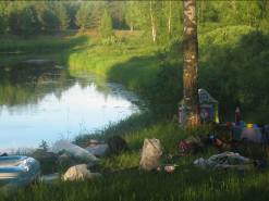 Стало быть, время срочно вылезать на берег и ставить палатку. Но как всегда, стояночные места слиняли. Тянулся малоприветливый лесок на неприставучем берегу. Но там, где он отступил от берега, мы, не мешкая, вылезли и начали ставить палатку. К сожалению, не успели поставить над ней тент, чтоб гарантированно полностью уберечься от дождя. И кое-как затащили вещи в палаточный тамбур.
