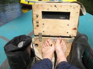 Сразу за нашим местечком начинался мелкий каменистый перекат. Я сел днищем на какой-то камень, а пока слезал с него, моя плохо привязанная буксируемая лодочка отвязалась и поплыла сама дальше. Течение было сильным, а вторая лодка с дамами уплыла еще раньше и маячила впереди. Затем застряла и неуправляемая лодка на совсем уж мелководье. А у меня коротенькие сапожки.