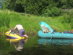 Пришлось пристать к берегу, борясь с сильным течением, разуваться и топать к той лодке босиком метров 50 по камням и холодной воде. Противная операция под непрерывным дождем. Сам виноват – надо хорошо привязывать лодки.