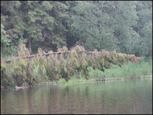 А солнышко в этот день жарило, и снова не к добру! Удобных стоянок на берегу не было видно, за исключением одной, – в елово – лиственном мрачноватом лесу. Здесь даже имелась основа для баньки с «парилкой» в виде кучи камней и остовом для тента. Но место действительно мрачноватое, не в нашем вкусе.