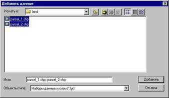 3. Дважды щелкните на папке land. 4. Щелкните на шейп%файле parcel_1, затем одновременно на клавишу Shift и на parcel_2, чтобы выбрать их оба. 5. Нажмите Добавить.