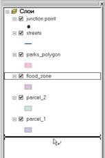 5. Щелкните на слое улиц (streets) и перетащите его на кар% ту. 6. В дереве каталога откройте папку utility в папке City_share, щелкните на нее и перетащите на карту по% крытие узлов сети стока. 7. Наконец, откройте базу геоданных WaterProject щелкни% те на классе объектов parks_polygon и также перетащите его на карту.