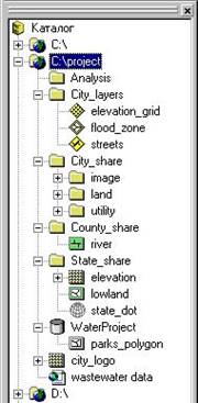 Теперь в дереве каталога показаны только данные, необхо% димые для проекта. (Возможно, потребуется щелкнуть Вид, затем Обновить, или закрыть и снова открыть ArcCatalog, чтобы увидеть слой elevation_grid и карту wastewater data, которые вы создали после последнего обращения к ArcCatalog.)