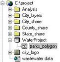 Изучите информацию о системе координат Перед определением системы координат для шейпфайла низинных территорий изучите параметры систем коорди нат базы данных города и грида высот. Для этого просмотри те метаданные по этим наборам данных. 1. В ArcCatalog найдите в дереве каталога базу геоданных WaterProject в папке проекта. 2. Откройте содержимое базы геоданных и нажмите на класс объектов parks_polygon (полигоны парков).