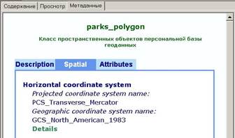 Вы увидите, что в системе координат класса объектов parks_polygon использована Поперечная проекция Мерка тора. Метаданные содержат информацию о каждом наборе дан ных. ArcGIS автоматически записывает и поддерживает часть информации; другую информацию вы добавляете ин терактивно. Метаданные неоценимы при совместном исполь зовании наборов данных и при составлении описаний про ектов ГИС. В данном проекте вы получите из метаданных информацию для выполнения нескольких шагов. Метаданные позволяют хранить массу информации о наборах данных: источник, этап обработки, качество данных, значения атрибутов и многое другое. Мы предоставили необходимую вам ключевую ин формацию по некоторым наборам данных. В реальном проекте ГИС вы будете использовать метадан ные для отслеживания изменения существующих наборов и описания новых наборов, созданных по ходу выполнения проекта. Добавление и обновление метаданных требует вре мени, но оно всегда окупается либо при повторном обраще нии к набору данных, либо при его использовании другими службами, либо для просмотра пройденных шагов.