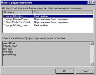 1. В панели редактирования нажмите на стрелку вниз у поля Редактор и выберите Начать редактирование; щелкните на кнопке Панель редактирования, чтобы открыть эту па% нель, если ее нет. 2. В диалоговом окне Начать редактирование укажите пап% ку Analysis как источник редактируемых данных и на% жмите OK. Нажмите Начать редактирование, чтобы за% крыть сообщение, что вы начинаете редактирование в разных системах координат.