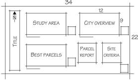 Вам также необходимо включить в карту пояснительный текст и другие элементы, чтобы сделать ее более понятной и более привлекательной. Потребуются следующие дополнительные элементы карты: • Отчет о наиболее пригодных участках в форме списка • Текстовое описание критериев выбора участка • Заголовок карты • Масштабная линейка для каждого фрейма данных • Легенда для каждого фрейма данных • Стрелка севера • Логотип города • Справочная информация по картам • Графические рамки, завершающие композицию карты После того, как вы решили, какие карты демонстрировать и какие дополнительные элементы включить, следует опреде% лить, как эти элементы будут размещены на странице. Хотя в ArcMap очень легко менять положение и размер отдельных карт и других элементов, возможно, вы захотите сначала нарисовать план на бумаге, чтобы руководствоваться им при компоновке карты. План должен как минимум показывать примерное расположение карт и картографических элемен% тов, а также содержать информацию об их размере и о раз% мере всей карты. При создании карты вы сможете в интерак% тивном режиме перемещать элементы и менять их размер.