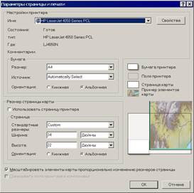 Появляется диалоговое окно Параметры страницы и печати. Включена опция “Размер бумаги принтера”, что означает, что ArcMap автоматически определит размер страницы прин тера. В городском управлении есть еще один принтер, на котором можно печатать страницы размера D (22 x 34 дюймов), по этому соответствие размера страницы заданному по умол чанию принтеру вам не подходит.