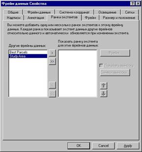 4. Откройте закладку Рамки экстентов. Вы покажете положение фрейма исследуемой области. 5. Щелкните на Study Area в списке Другие фреймы дан% ных. 6. Нажмите на стрелку вправо, чтобы переместить Study Area в список в правом окне.