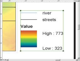 Теперь измените текст для слоя высот. 10.Щелкните на Value под слоем elevation, чтобы выбрать его. Щелкните еще раз, чтобы выделить это название. Наберите “elevation” и нажмите Enter. 11.Нажмите на кнопку Страница целиком в панели инстру% ментов Компоновки, чтобы снова увидеть всю карту.