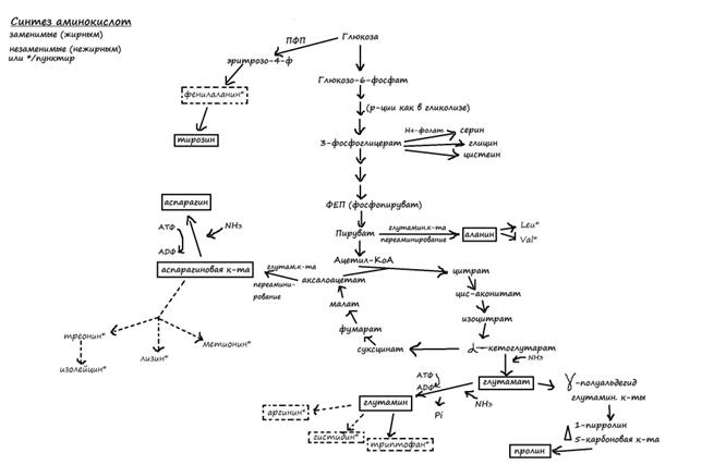 81. Общие принципы обмена аминок-т. Нарушение обмена белков и аминок-т. Белковая недостат-ть развив-ся у ч-ка как при полном, так и при частичном голодании, так и при приеме однообразных белков в питании. Когда в диете преоблад. растит. белки - биологич.ценность которых ниже животных белков, результат-отриц. азотистый баланс (кол-во поступающего азота меньше кол-ва выводимого из орг-ма). Гипопротеинемии (понижение концентрации белков в сыворотке до 30-50гр/л. Нарушение коллоидно-осмотического и водно-солевого обмена(развитие отеков). При тяжелых формах пицеварительной дистрофии наблюдается поражение печени, остановка роста, резкое снижение иммуного столбца, отечность, атомия м-ц. При белковой недостаточности резко понижается интенсивность процессов дезаминирования, трансаминирование и биосинтез аминок-т, а также активность цикла мочевины в печени из-за недостаточного синтеза нужных ферментов, следует аминоацидурия до 10-20 г/сутки (в норме 1г в сутки), повышение концентрации свободных аминок-т в крови и снижение экскреции мочевины. Увелич-ся уровень распада белков. Гипераминоацидурия делится на 1)почечную ( связана с приобретенным или врожденным дефектом реабсорбции аминок-т в почки); 2)Внепочечную (связана с повышенной концентрацией аминок-т в крови).Причины почечной аминоацидурии служат -Хронич. нефрит, нефрозы, наследств.заболевания такие как цистиноз (врожден.нарушение реабсорбции почти всех аминокислот-повыш-е в 5-10 раз экскреции всех аминок-тв 20-30 раз цистина и цистеина, отложении цистина в клетках РЭС, селезенки, печени и роговицы глаза) и цистинурия(наруш-е реабсорбции и повышения выведения мочой цистина, аргинина, лизина, орнитина в 50 раз, повыш-ся вероятность образования камней в почках. Некоторые энзимопатии