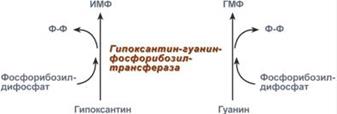 83. Реутилизация пуриновых оснований. Гиперурикемия. Синдром Леша-Нихана. Подагра, причины и сущность заболевания принципы лечения. Реутилизация пуриновых оснований- процесс повторного их использования. Актуален в быстрорастущих тканях, когда активно идет процесс синтеза нуклеин.к-т и недопустима потеря их предшественников. Сущ-ет 2 способа реутилизации: 1способ - заключается в присоединении рибозо-5-фосфата к свобод.основаниям гуанину, аденину или гипоксантину с образованием АМФ, ГМФ или ИМФ