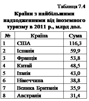 Останніми роками найвідвідуванішою країною світу є Франція – 70–80 млн щороку. Понад 50 млн іноземних туристів щороку відвідують США, Китай, Іспанію та Італію. Дещо поступаються їм Італія, Велика Британія, Туреччина та інші країни (табл. 7.3). Найбільші надходження від в’їзного туризму отримують США. Основним чинником випередження інших європейських країн є більші розміри і триваліше перебування. Великими є прибутки від туризму в Іспанії, Франції, Італії, Китаї (табл. 7.4).