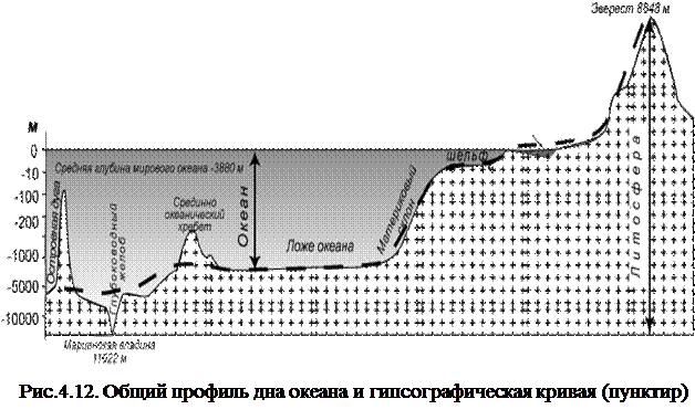 Крупнейшие геологические структурыземной коры - континенты и океанические впадины). Между ними существуют серьезные различия в строении земной коры и подстилающей ее верхней мантии: - под континентами толщина земной коры составляет 35-80 км, под океанским дном 5-10 км; - в разрезе земной коры континентов выделяются " осадочный ", " гранитный " и " базальтовый " слои; под океанами "гранитный" слой отсутствует; - " астеносфера " - слой, в котором мантийное вещество находится пластичном состоянии, под материками залегает на глубине более 150 км, под океанами – 15-150 км. Если выразить графически рельеф материков и дна океанов в качестве различных ступеней общего рельефа Земли, получится так называемая " гипсографическая кривая " (греч. " гипсос " - высота, " графо " – пишу) земного шара (рис.4.12).
