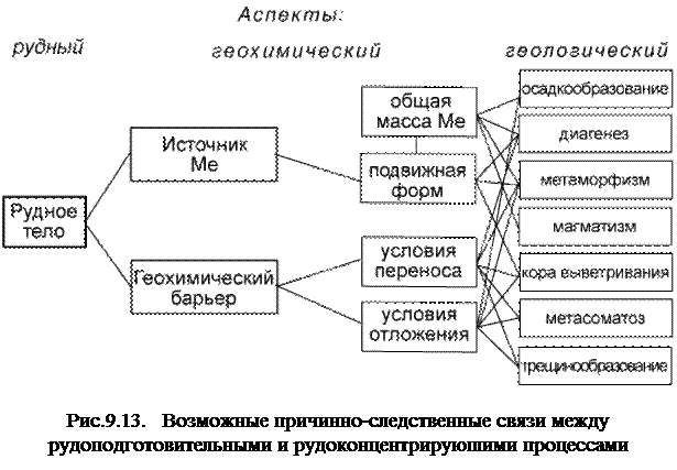 Рассмотрим в общем виде совокупность геологических условий, приводящих к формированию рудных скоплений на геохимических барьерах (рис.9.13). Будем двигаться непосредственно от конечного результата – рудного тела к тем подготовительным процессам, которые и определили возможность проявления конечного результата. С геохимической точки зрения для образования рудных скоплений вещества необходим геохимический барьер и источник металла. Источником может являться не любая масса элементов, а только та, которая способна мигрировать на те или иные расстояния. Источник рудного вещества подразумевает не только наличие больших его масс в данном геологическом пространстве, но и подвижной формы, причем с достаточными количестве. Формирование повышенных концентраций может быть связано с процессом осадконакопления, а для отдельных горизонтов и с диагенезом, метаморфизмом, магматизмом и формированием древних кор выветривания.