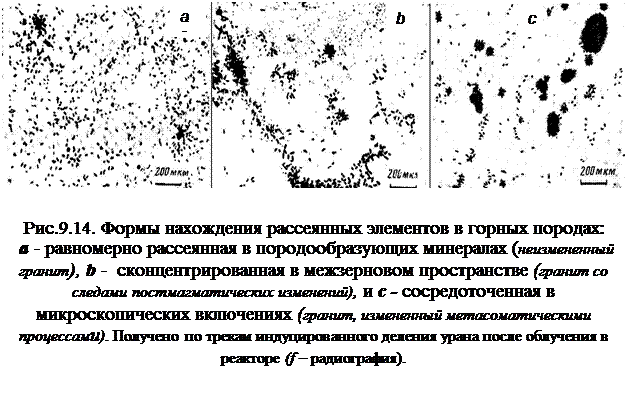 Так еще С.С. Смирнов обратил внимание на то, что в полиметаллических месторождениях Рудного Алтая промышленные тела включают руды Pb, Zn и Cu, а в месторождениях В. Забайкалья медь не дает промышленных концентраций, а лишь минералогические выделения. Он объяснил этот эмпирический факт различием региональных фоновых содержаний меди: повышенных на Алтае и пониженных в Забайкалье. Появление потенциально подвижных форм может происходить при различных процессах преобразования пород. Это и диагенез, и метаморфизм региональный или контактовый, и метасоматические преобразования, образование древних кор выветривания и т.д. Примеси рудных элементов, запечатанные в породообразующих минералах, не могут мигрировать, пока не освободятся от сковывающей их матрицы. Такое «освобождение» часто происходит при наложении более поздних процессов изменения исходных пород, начиная от автометасоматических процессов и до поздних гипергенных изменений. Рисунок 9.14 дает наглядное представление о характере распределения микропримеси урана – в породообразующих минералах в неизмененном граните и в межзерновом пространстве в в зонах диафтореза и метаморфизма пород того же массива. Наконец, в создании условий локального отложения вновь могут участвовать многие геологические процессы. Известны случаи, когда начало рудоподготовительных процессов относится к нижнему палеозою, а непосредственное формирование рудных тел происходит только после позднемезозойской активизации.
