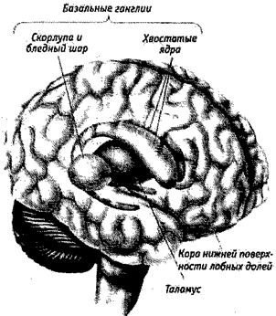 Рисунок 5.4. Биология обсессивно-компульсивного расстройства. Трехмерная картина мозга (с частями, показанными так, как если бы лежащие над ними мозговые оболочки были прозрачными) показывает мозговой цикл, который исследователи связывают с обсессивно-компульсивным расстройством. В нормальном состоянии хвостатые ядра фильтруют импульсы, возникающие в коре нижней поверхности лобных долей, так что лишь наиболее мощные из них достигают таламуса. Возможно, что у людей с обсессивно-компульсивным расстройством эти области являются слишком активными. (Rapoport, 1989, р. 85, адаптировано.) Кора нижней поверхности лобных долей — зона головного мозга, в которой обычно возникают импульсы, вызывающие экскретивную, сексуальную, агрессивную и другие примитивные активности. Хвостатые ядра — структуры в базальных ганглиях мозга, помогающие переводить сенсорную информацию в мысли и действия. В поддержку этой теории говорят многолетние медицинские наблюдения возникновения или затухания симптомов обсессивно-компульсивного расстройства вследствие повреждения коры нижней поверхности лобных долей, хвостатых ядер или смежных зон мозга в результате несчастного случая или болезни (Мах et al, 1995; Paradis et al., 1992). Позитронно-эмиссионная томография (РЕТ-сканировапие), которая дает рисунок мозговой активности, показала, что хвостатые ядра и кора нижней поверхности лобных долей пациентов с обсессивно-компульсивным расстройством более активны, чем у контрольной группы (Pato & Pato, 1997; Baxter et al., 1990). Эти линии исследований могут быть связаны между собой. Поскольку медиатор серотонин играет большую роль в процессах, проходящих в коре нижней поверхности лобных долей и хвостатых ядрах, его низкая активность может серьезно мешать нормальному функционированию этих областей. < Психологические заметки. К моменту рождения человека нейроны в его мозге формируют более 50 миллиардов синапсов, или соединений. За первые месяцы жизни число их возрастает в двадцать раз, достигая более чем 1 000 миллиардов (Begley, 1997).> Биологические методы терапии обсессивно-компульсивного расстройства. Как мы упоминали выше, исследователи узнали, что определенные антидепрессанты полезны для терапии обсессивно-компульсивного расстройства (Pato & Pato, 1997; Greist et al., 1995). Они не только повышают активность серотонина в мозге, но и обеспечивают более близкую к нормальной активность в коре нижней поверхности лобных долей и хвостатых ядрах (Baxter et al., 1992). Исследования показали, что применение кломипрамина (Anafranil), флуоксетина (Prozac) и флувоксамина (Luvox), вызывает улучшение у 50-80 % людей, страдающих обсессивно-компульсивным расстройством (Black et al., 1997; Taylor, 1995). Навязчивые идеи и навязчивые действия людей, которые принимают эти антидепрессанты, обычно полностью не исчезают, но в среднем вдвое сокращаются за восемь недель лечения (DeVeaugh-Geiss et al., 1992). Тем не менее люди, улучшение состояния которых основано только на медикаментозной терапии, склонны переживать рецидивы после отмены препарата (Taylor, 1995; Michelson & Marchione, 1991). Таким образом, методы терапии обсессивно-компульсивного расстройства, как и терапия панического расстройства, претерпели значительное улучшение в течение последнего десятилетия. Бывшее некогда тяжелой проблемой, обсессивно-компульсивное расстройство теперь поддается нескольким формам терапии, особенн
