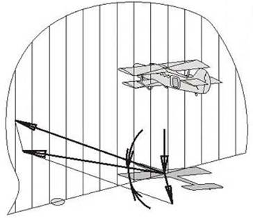 Визуальное определение траверза представляет собой очень сложную задачу. Плоскость, параллельную вектору ускорения свободного падения определить нетрудно, достаточно провести мысленный перпендикуляр через горизонт. Однако таким образом можно построить множество плоскостей, в пределах видимого сектора горизонта. Лишь одна из них - перпендикулярная навигационному курсу ЛА является траверзом. Однако определить ее нелегко. Визуальное определение перпендикуляра к навигационному курсу (направлению движения ЛА) производится путем сравнения угловых скоростей точек, расположенных на прямой, параллельной навигационному курсу (рис. 8).