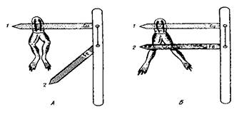 1) Готовим нервно-мышечный препарат двух задних лапок лягушки, не отделяя их друг от друга. Одну браншу проводим под корешки крестцового отдела спинного мозга лягушки. При соприкосновении второй бранши с мышцами бедра наблюдаем сокращение. Частота сокращений соответствует частоте прикосновений. 2) Повреждаем часть мышцы и кладем препарат на стеклянную пластинку. На поврежденный участок мышцы крючком набрасываем нерв так, чтобы его средняя часть касалась неповрежденной поверхности мышцы. 3) Готовим 2 препарата задних лапок лягушки. Мышцы бедра удаляем. Обе лапки подвешиваем за бедренную кость в держателях. Нерв одного препарата помещаем на электроды, а нерв другого располагаем вдоль икроножной мышцы первого. Ретмически раздражая нерв вызываем сокращение мышц первого препарата, наблюдаем за сокращением мышц второго.