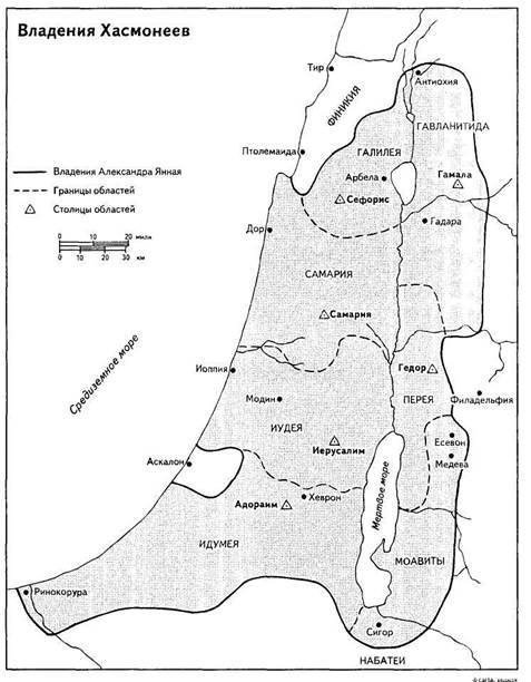 Сопротивление иудеев вспыхнуло быстро. В селении Модеин (или, по-другому, Модин) присланные от царя Антиоха люди принуждали старейшего священника по имени Маттафия подать пример местным жителям, совершив на их глазах языческое жертвоприношение. Маттафия отказался. Когда какой-то другой иудей вышел и изъявил свое согласие, Маттафия убил его, убил царского представителя, разрушил жертвенник и бежал в горы со своими пятью сыновьями и другими сочувствующими. Так в 167 г. до Р. X. началось восстание Маккавеев под руководством людей из рода Маттафии. Мы называем этот род Хасмонеи, от имени Хасмона, прапрадеда Маттафии, или Маккавеи, от прозвища «Маккавей» («молот»), данного Иуде, одному из сыновей Маттафии. Иуда Маккавей, возглавив восставших, вел чрезвычайно успешную партизанскую войну, пока не оказался в состоянии разгромить сирийцев в генеральном сражении. Восстание Маккавеев вызвало также гражданскую войну между иудеями, выступающими за и против эллинизации. Эта борьба продолжалась даже после смерти Антиоха Епифана (в 163 г. до Р. X.). В конце концов Маккавеи изгнали сирийцев из своей цитадели в Иерусалиме, добились религиозной свободы, заново освятили храм и овладели Палестиной. После того как Иуда Маккавей был убит в сражении (160 г. до Р. X.), его место заняли его братья — Ионафан, а затем Симон. Играя на противоречиях между претендентами на престол Селевкидов, они извлекли из ситуации значительные выгоды для иудеев. Ионафан начал отстраивать разрушенные стены Иерусалима и его здания. Он также принял сан первосвященника. Симон добился признания иудейской независимости от Димитрия II, претендента на престол Се-левкидов, и обновил договор с Римом, заключенный ранее Иудой. Провозглашенный «великим первосвященником, главнокомандующим и вождем иудеев», Симон официально объединил в своих руках религиозную, военную и гражданскую власть в иудейском государстве. Последующая история династии Хасмонеев (142 — 37 гг. до Р. X.) сводится к печальному сюжету внутренних распрей, вызванных жаждой власти. Политические устремления и интриги Хасмонеев оттолкнули от них многих из их бывших сторонников, религиозно настроенных хасидов, которые разделились на фарисеев и ессеев. К одной из общин ессеев относятся так называемые «свитки Мертвого моря» из Кумрана. (См. с. 63, 67-68.) Имеющие аристократические взгляды и более политизированные сторонники царей-священников Хасмонеев составили группировку саддукеев. В конечном счете римский полководец Помпеи завоевал Палестину в 63 г. до Р. X. Таким образом, в новозаветный период Палестина была подчинена Риму. Римский период