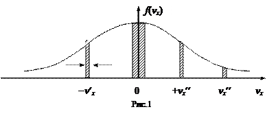 График функции f (vx)изображен на рис. 1. Функция имеет максимум при vx = 0, симметрична относительно его и экспоненциально стремится к нулю при vx ® ± ¥. Отложим по оси абсцисс элементарные скоростные интервалы dvx около значений vx, равных 0; ± vx ¢; ± vx ¢¢. Произведение f (vx) dvx равно доле молекул, компонента скорости vx которых лежит в интервале около указанных значений. С другой стороны, произведение f (vx) dvx на графике равно заштрихованным площадкам около выбранных скоростей.