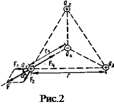 де F2, F3, F4 - сили, з якими відповідно діють на заряд Q1 заряди Q2, Q3, Q4; F - рівнодіючих сил F2 і F3. Тому що сили F і F4 спрямовані по одній прямій у протилежні сторони, та векторна рівність (1) можна замінити скалярним: F – F4 = 0, звідки F4=F. Виразивши в останній рівності F через F2 і F3 і з огляду на те, що F3=F2, одержимо