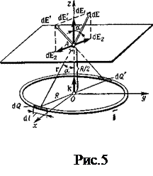 де r - радіус-вектор, спрямований від елемента d l до точки А. Розкладемо вектор dЕ на дві складові: dE1, перпендикулярно площині кільця (що збігається з віссю O z ), і dЕ2, паралельну площині кільця (площини х О у), тобто