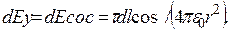 де r - радіус-вектор, спрямований від елемента dl до точки, у якій обчислюється напруженість. Виразимо вектор dЕ через проекції dЕ х і dЕ у на осі координат:
