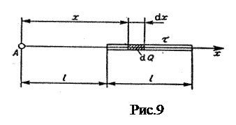Приклад 9. На тонкому стержні довжиною l є рівномірно розподілений заряд з лінійною густиною t=10нКл/м. Знайти потенціал j, утворений розподіленим зарядом у точці А, розташованої на осі стержня і віддаленої від його найближчого кінця на відстань l.