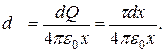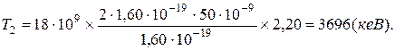 Виразимо всі величини в одиницях СІ (Q=2.1,60.10-19 Кл, t=50.10-9 Кл/м, 1/(2pe0)= 18.109 м/Ф) і зробимо обчислення (1/(1,60.10-19) — коефіцієнт перекладу з Дж в еВ):
