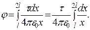 Відповідно до принципу суперпозиції електричних полів, потенціал електричного поля, утвореного зарядженим стержнем у точці А, знайдемо інтегрування цього виразу: