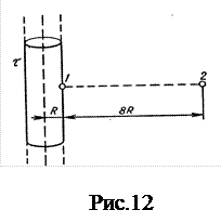 Приклад 14. З поверхні нескінченного рівномірно зарядженого (t=50 нКл/м) прямого циліндра вилітає a - частинка (u0=0). Визначити кінетичну енергію Т 2 a- частинки (кеВ) у точках 1 і 2 на відстані 8 R від поверхні циліндра (рис. 12). Розв’язок. Тому, що сили електростатичного поля є консервативними то, для визначення кінетичної енергії a- частинки в точці 2 скористаємося законом збереження енергії, записаному у вигляді Е 1= Е 2, де Е 1 і Е 2 - сповненої енергії a-частинки в точках l і 2. Так як E1=T1+U1 і E2=T2+U2 (Т 1 і Т 2 - кінетичні енергії a -частинки; U 1 і U 2 — потенційні), тоді, з огляду на те, що Т1=0 (u0=0), можна записати U1=T2+U2, звідки Використовуючи рішення прикладу 11, запишемо: